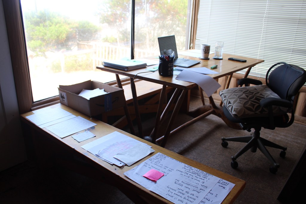 Mid week. Notes. Office supplies. Coffee. Water. And a view of the ocean.