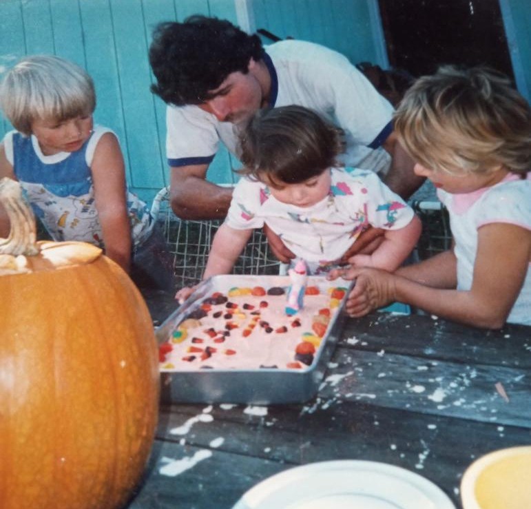 Today, Aunt Julie shared a picture of us that I’d never seen. It was taken on my second birthday, outside the house on Glenn Street. Someone (was it you?) made me a sheet cake and spelled out my name in candy corn. What I love about the picture is that as I am blowing out my birthday candles, so are you. You were ever encouraging, attuned, a gentle wind at my back from day one. God, I look like Autumn in the photo. A few years ago, unwittingly, I also decorated her birthday cake with candy corn. October babies.