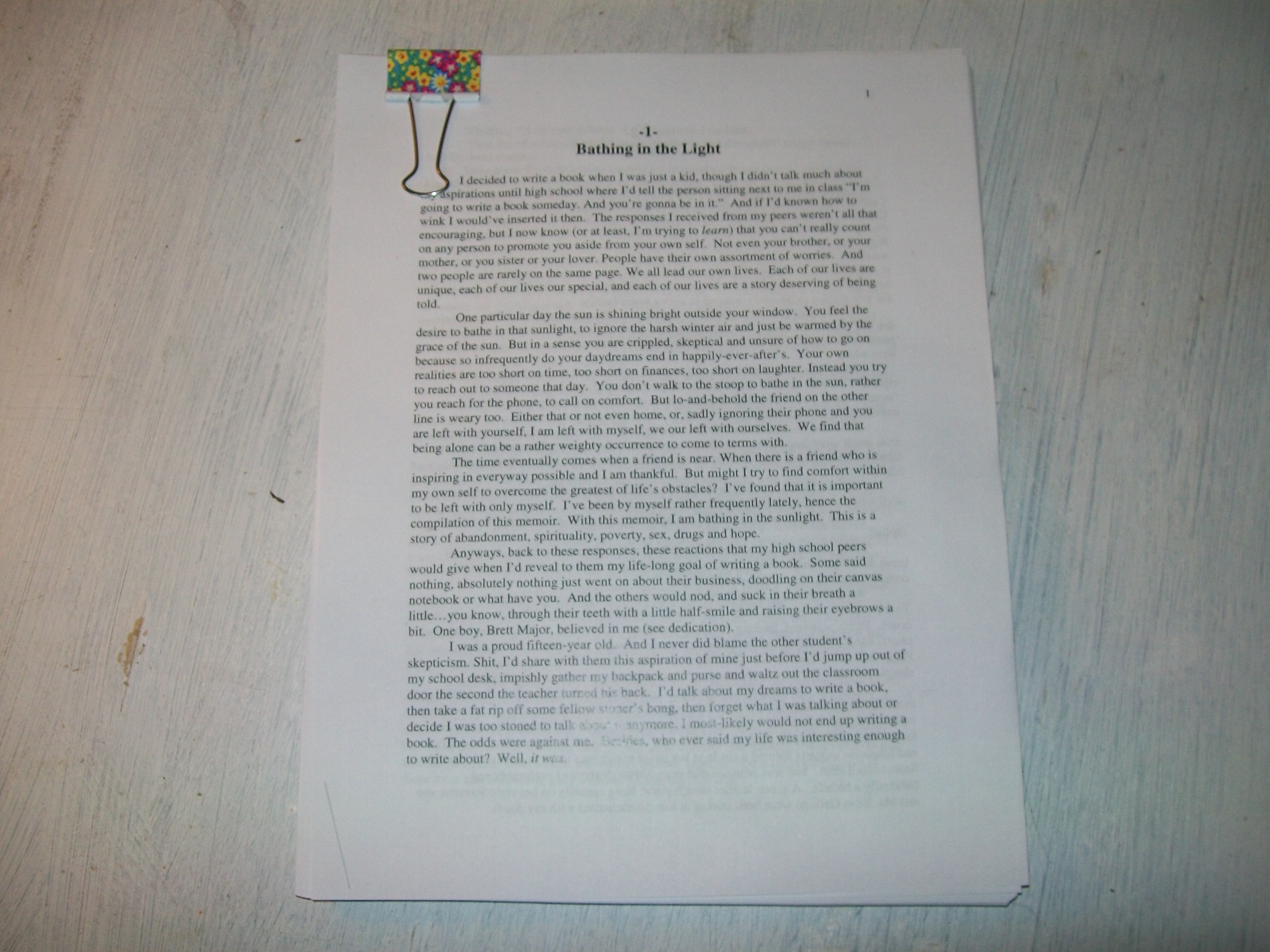 An hour later and I’m at Office Depot on 11th Ave., one of my favorite places, picking up a copy I had made of my memoir. Of most of my memoir. Of my memoir, minus the ending, as you know. It is fruit. It is the fruit of my labor. It is not ripe, no, but it is there. It is food, it is hope, it is tangible and fucking sexy as hell. It is a joy to be this far. Tomorrow Nan and I will talk about, well, whatever I want to talk about and in another small way, I will have arrived. I said in the beginning that I was writing this book for me. And if that is so, than I have made myself very happy today. I am pleased today, for myself. I say most of the time nowadays that I am writing this book for other people. That is the idea, to share it with other people. Maybe with young girls who are becoming women and are making decisions and need someone to relate with. Maybe for men who like reading memoirs. Maybe with you.