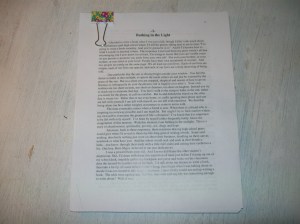 Thirty minutes later I was done. Done. There was the draft, everything I had written, nice and tidy on the corner of a square pine table in a library, in Eugene, Oregon, in a sunny room, in the best place in the world as far as I was concerned. I still needed to double-check my zip drives for scenes that may not have made it to print, as I didn’t recall seeing Tyson or Dug Out — two very important scenes. A few minutes later, in the computer lab I found that yes, there were still scenes to print and merge. I printed, I merged again, big smile on my face, standing at the square, pine table in the sunny room near a wall of local art that I really enjoyed and took a moment to look at, remembering how in the email my boyfriend’s mother sent me today she said “don’t forget to stop and smell the roses”. Good point.