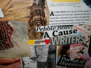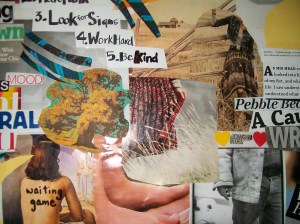 To make a Visionboard, instinctively clip images and words without thinking too much about it. Then tape or paste the words and pictures together–the result being truths revealed about you. Truth about me: I want to be able to work a “real job” and be a successful writer too.